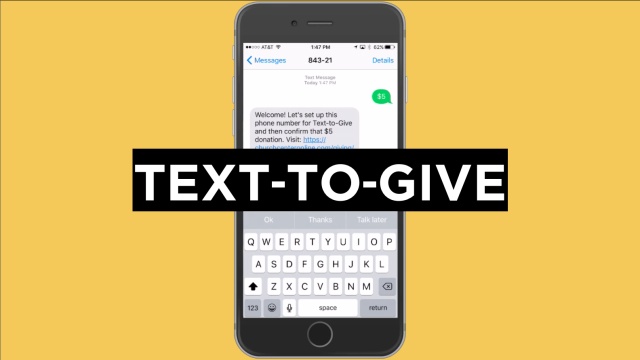 Giving is as easy as sending a text! Just text any amount to 84321. First time users just follow the prompts to set up. You will receive a text confirming your gift.